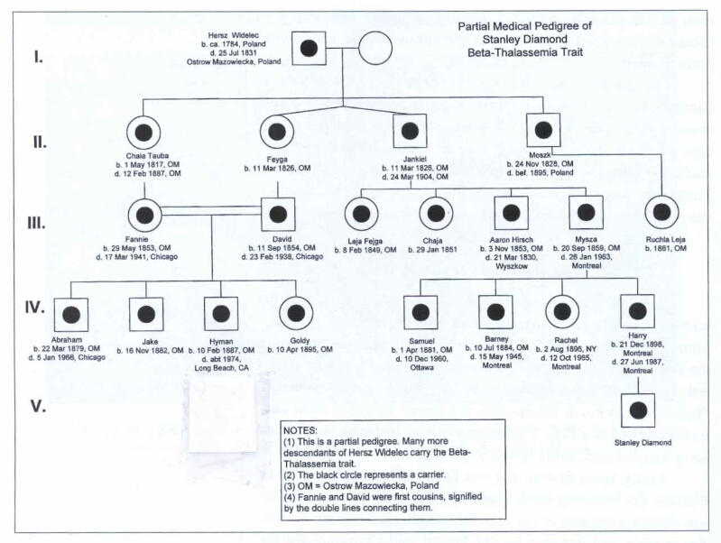 Project goal Although my initial goal in this project was to find other carriers of the specific mutation carried by my family (originally from Ostrow Mazowiecka [Ostrova] in the old Lomza Gubernia of Poland) and a family in Jerusalem (originally from Bobruysk in Belarus) and identify the earliest carriers of this mutation in both families, I also want to alert unsuspecting Ashkenazic carriers outside my family. This is the most urgent aspect, because the beta-thalassemia genetic trait is not usually found unless physicians are looking for it. Carriers are often misdiagnosed as being anemic and are incorrectly prescribed iron. Most carriers in my family learned that they carried the trait later in life, in some cases - long after having grandchildren. This late diagnosis could have been disastrous. In addition to previously unknown branches of my family which I have found, outreach has turned up six other Diaspora Ashkenazic families carrying the trait. A few already launched programs to alert their extended families about the potential dangers to future generations. These families were found through JewishGen posts and articles in the general and Jewish press and Jewish Genealogical Society newsletters. On-site research in Poland and the cooperation of the Polish State Archives and key Civil Records Offices enabled me to document more than 50 additional families who may be at risk. With descendants of so many families to be traced and contacted, my task, already immense, has now become virtually unmanageable. I need help from my fellow genealogists, their friends, relatives, and physicians - anyone who might have knowledge of a carrier.